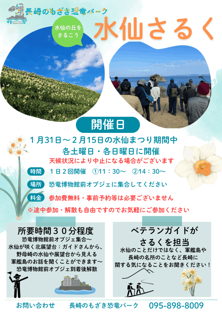 1月31日(土)~2月15日(日)に開催される水仙まつりに併せて恐竜パークのイベントとして「水仙さるく」を開催いたします。
