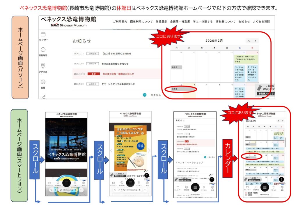 「ベネックス恐竜博物館」の休館日は「ベネックス恐竜博物館」のホームページで公開されています。